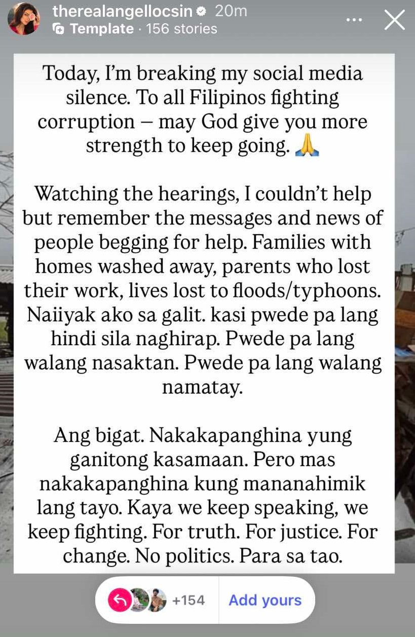 “Today, I’m breaking my social media silence. To all Filipinos fighting corruption – may God give you more strength to keep going,” Angel began her post.